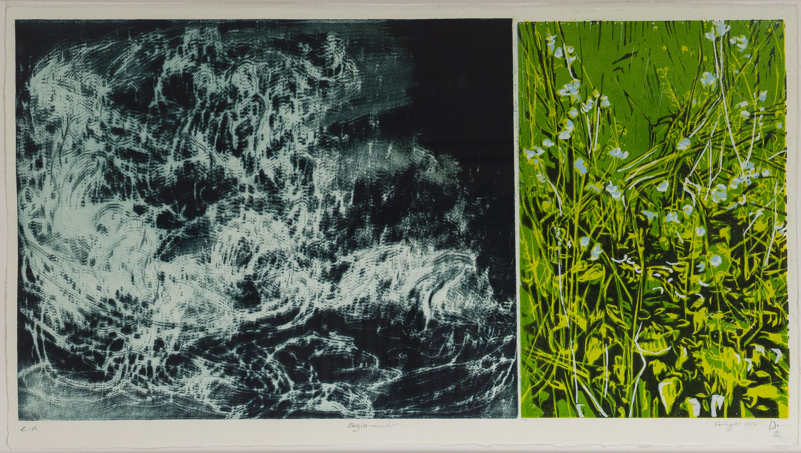 Vergissmeinnicht, Radierung (Aquatinta)/Holzschnitt) ,2020, 39 x 76 cm